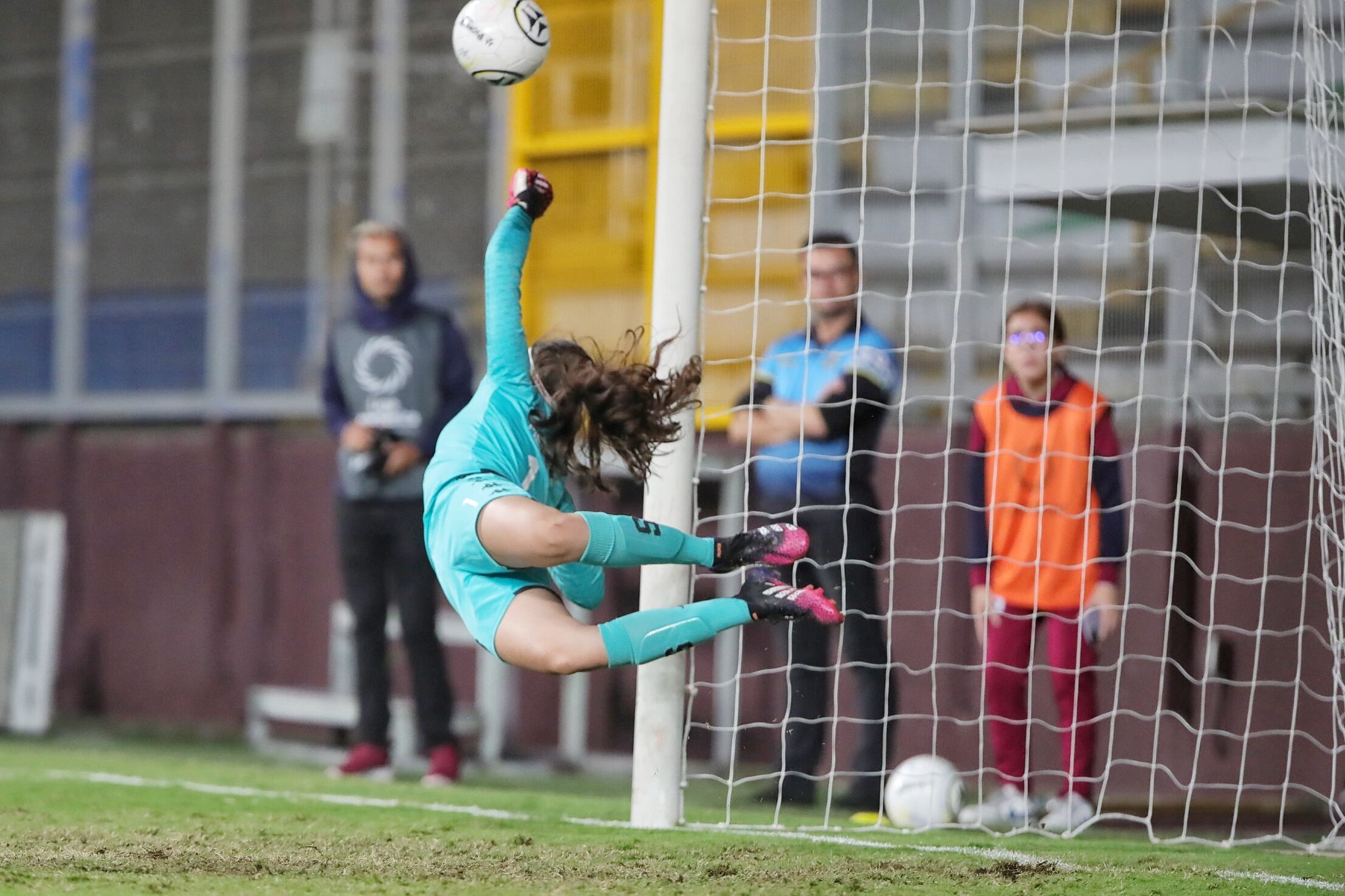 La portera morada Carolina Méndez detuvo un lanzamiento de penal al primer minuto del complemento. La arquera enmendó su error porque al perder el balón cometió falta. La forma en que detuvo el lanzamiento fue espectacular, se lanzó a su derecha y la sacó con una mano y luego repelió el contraremate.