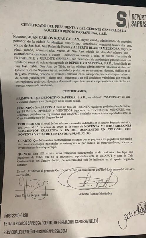 Los morados mostraron una certificación de carácter legal, donde dice que tienen 30 jugadores de primera división y 22 futbolistas de divisiones menores con salario, agregaron que no se le paga a ninguno de ellos por medio de otras sociedades extranjeras, socios o inversionistas de otro tipo.