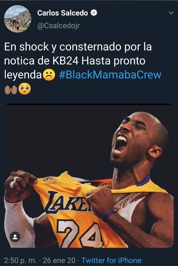 Salcedo realizó la publicación el día que se dio a conocer el trágico fallecimiento del exbasquetbolista y en el que el defensor de Tigres de la UANL publicó una foto y la frase: “En shock y consternado por la noticia de KB24, Hasta pronto leyenda”. Acompañando la publicación de la etiqueta o hashtag mencionado.