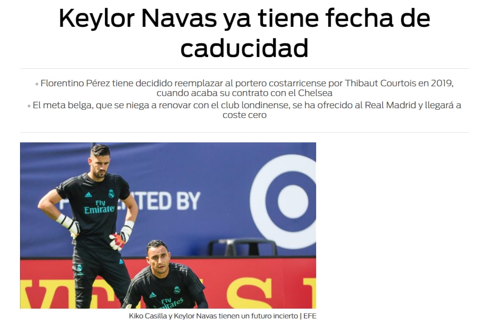 “Florentino Pérez, presidente madridista, nunca ha confiado plenamente en el meta costarricense ni tampoco en su teórico suplente, Kiko Casilla, y eso se ha traducido en varias ofensivas por David de Gea (Manchester United)... Florentino Pérez tiene decidido reemplazar a Keylor Navas por Thibaut Courtois en cuanto finalice el contrato del belga con el Chelsea, en junio del 2019”, dice la publicación.
