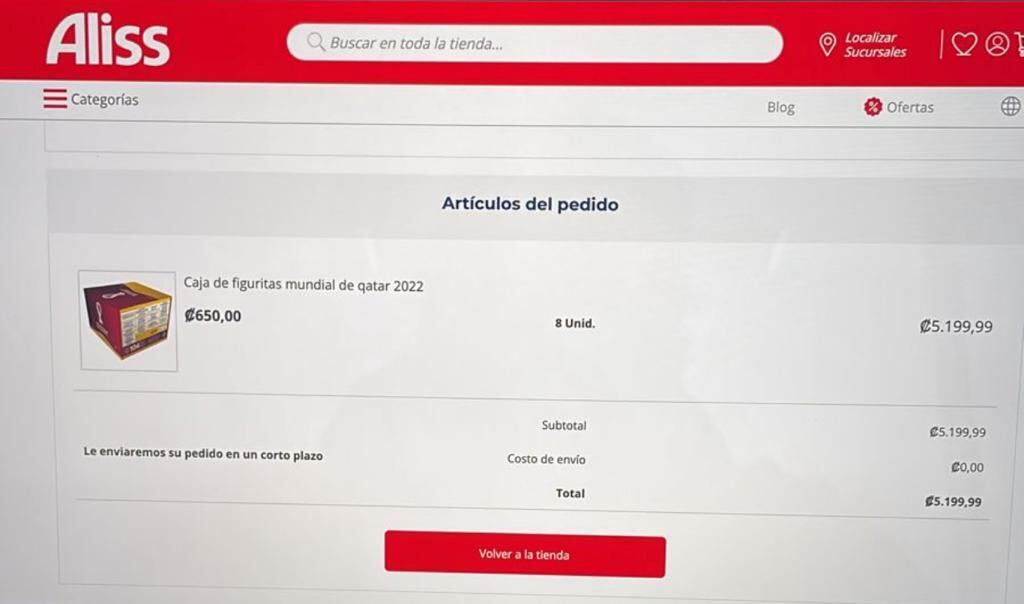 Cuando ingresó al sitio web se llevó la sorpresa de que tenían el cubo (caja) de sobres en ¢650, cuando el precio real es ¢67.600, por lo que compró 13 cajitas.