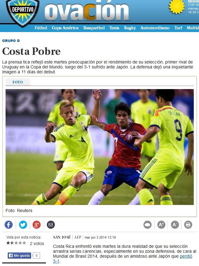 La nota la publicaron luego de que la selección dirigida por el técnico Jorge Luis Pinto cayera 3-1 contra Japón, en un amistoso el 4 de junio del 2014, mostrando problemas en defensa y falta de sintonía en el medio campo, aspectos preocupantes para la prensa costarricense, según el medio de comunicación charrúa.