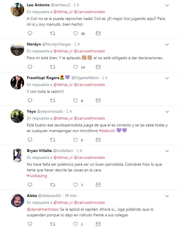 La noche de este miércoles, luego del clásico provincial, un grupo de periodistas se acercó a la zona mixta del estadio Ricardo Saprissa y al hacerle una consulta a Colindres, este solicitó que Martínez se retirara para así contestar.