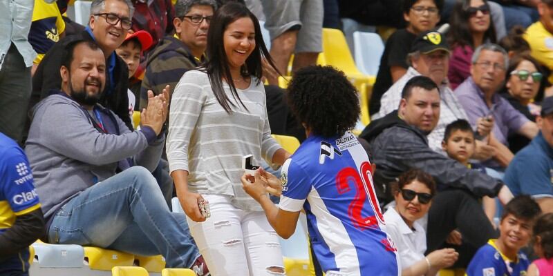 “Llevo planeando esto hace tres meses o incluso antes, compré el anillo, tenía planeado hacerlo unos partidos atrás, pero todo tiene un propósito y pude pedirle la mano a mi futura esposa. En el partido contra la Universidad de Conce anoté, pero tenía amarilla y si me subía a las gradas iba a recibir la tarjeta roja, entonces tuve paciencia", agregó.