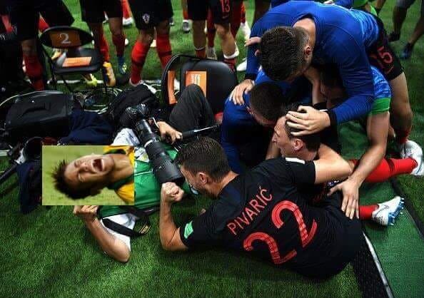 Los jugadores se comenzaron a empujar y terminaron aplastando a Yuri Cortez, un fotógrafo salvadoreño, quien sin querer se unió al festejo croata, y pese a tener el tumulto encima, con una enorme sonrisa, continuó capturando el jolgorio que se tenían los futbolistas.
