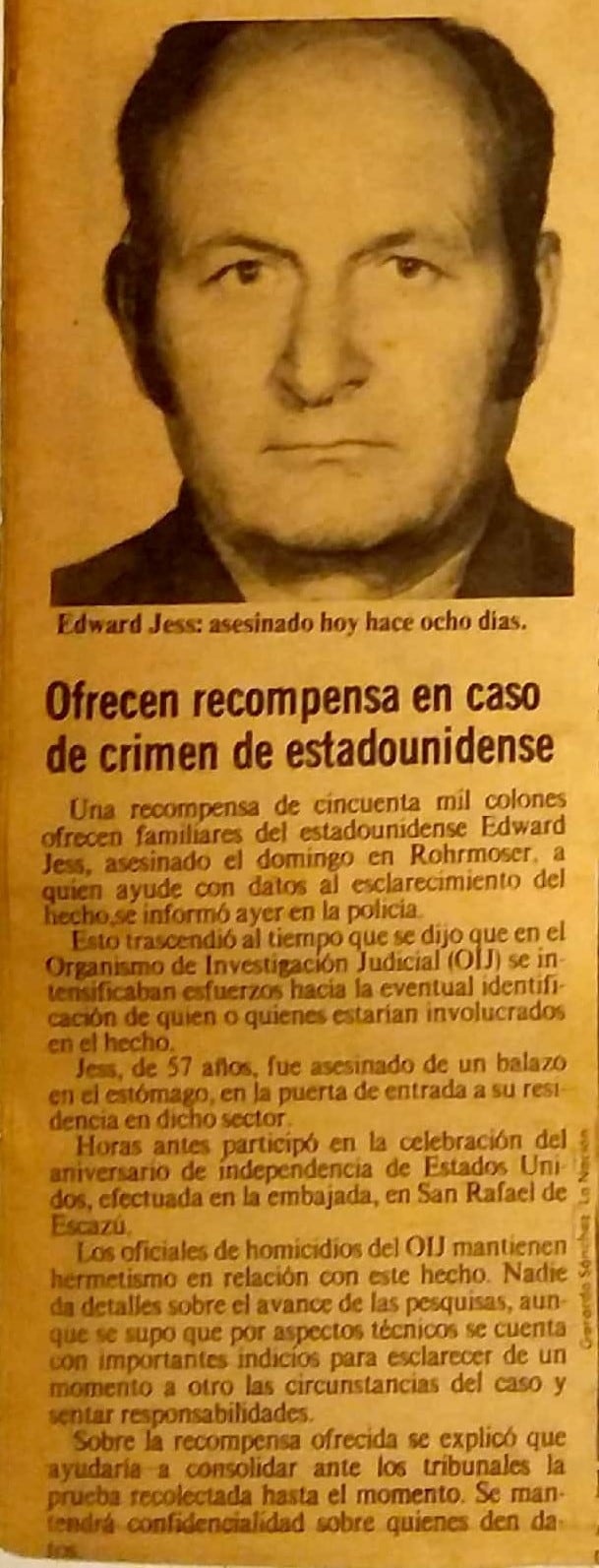 La familia de Edward estaba desesperada, quería que la justicia determinará quiénes fueron los asesinos y ocho días después del crimen, visitaron los medios de comunicación de aquella época, entre ellos La Nación, para anunciar que estaban dispuestos a pagar una recompensa de ¢50.000 a quien les diera una pista certera. Ese monto de dinero equivale en la actualidad a ¢4,1 millones.