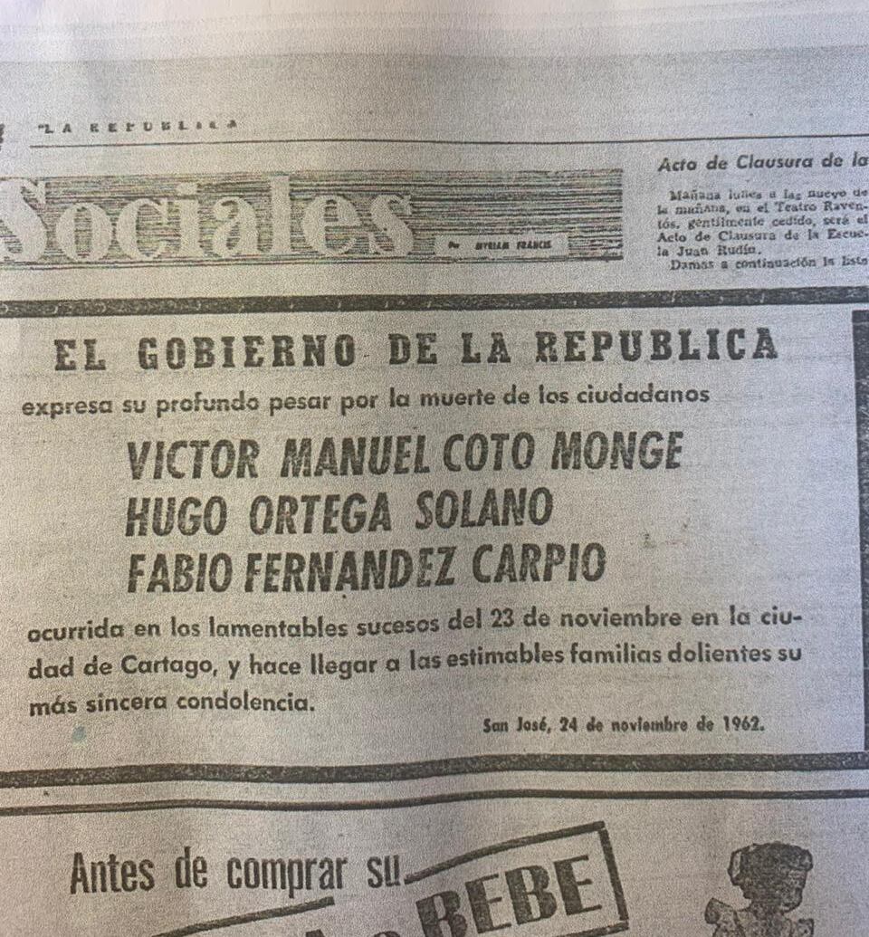 En su portada del sábado 24 de noviembre de 1962 el Diario de Costa Rica títuló: Masacre en Cartago; La República del domingo 25 hacía públicos los nombres de los tres fallecidos.