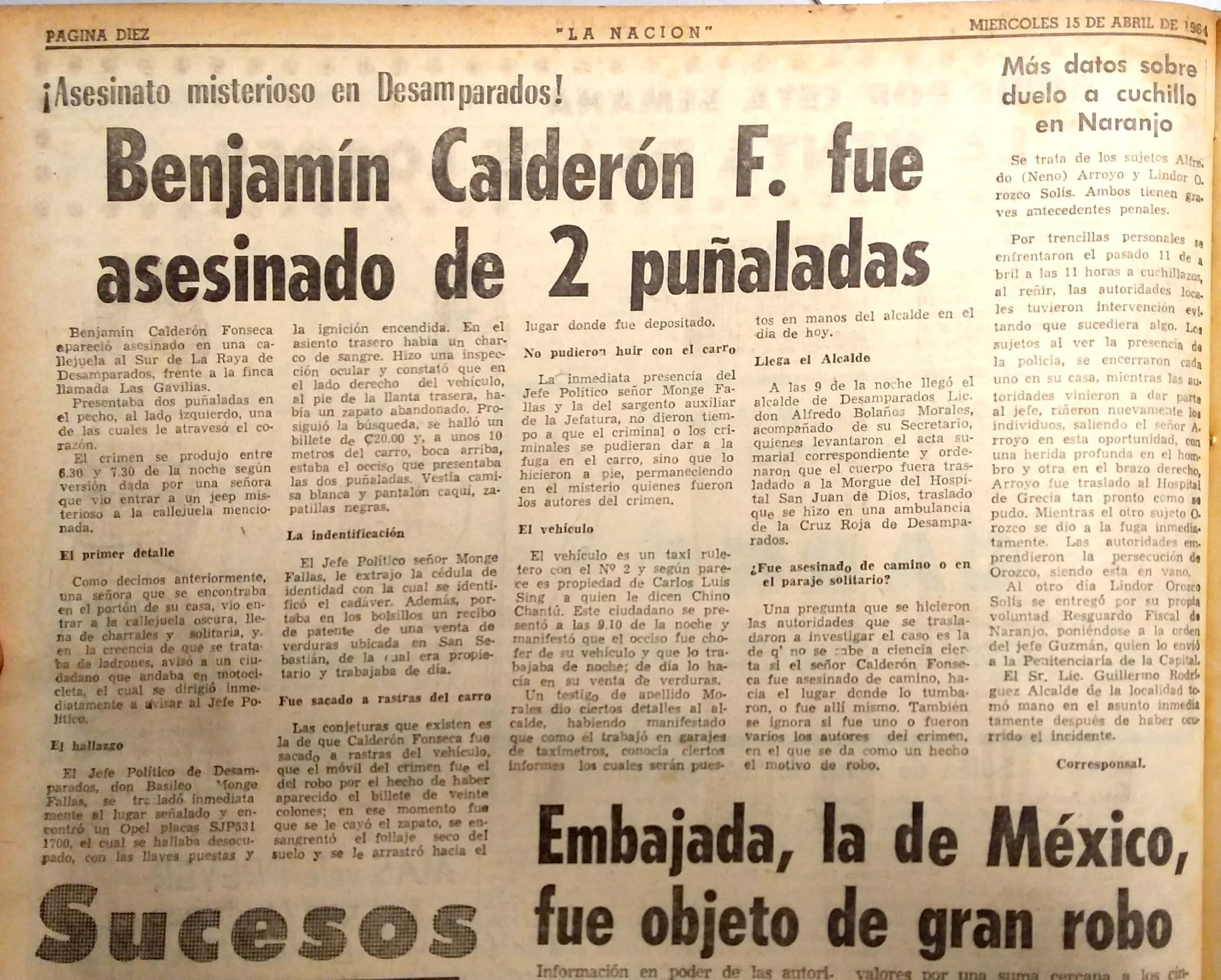 El asesinato del taxista Benjamín Calderón Fonseca, ocurrido el 14 de abril de 1964, marcó a quienes se dedican a ese brete en Costa Rica.