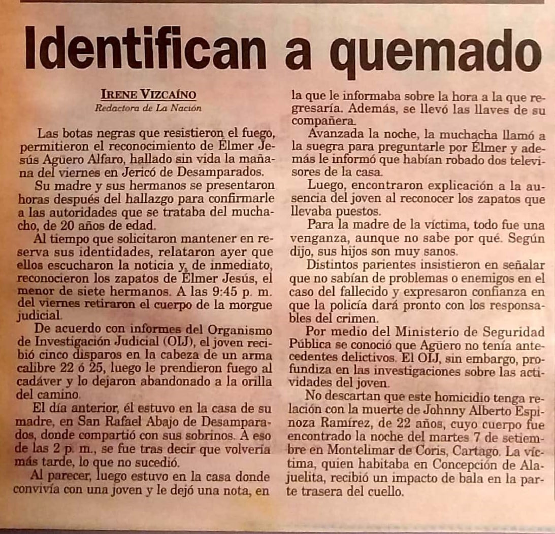 El 11 de setiembre de 1999, agentes de la Sección de Homicidios del OIJ de San José recibieron la información de que había aparecido un cuerpo en una parte muy solitaria de San Jerónimo de Desamparados. Las casas más cercanas al sitio donde apareció el cadáver se encontraban a unos 500 metros. Un ciclista que pasaba fue quien vio el cuerpo y les avisó a las autoridades.