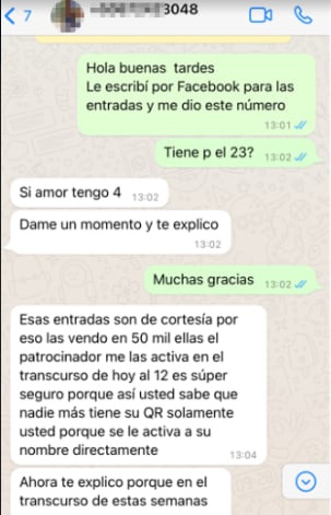 “Ella me mandó un audio explicándome todo y dándome credibilidad de que sí era cierto. Me dijo que si algo llegaba a pasar ella se hacía cien por ciento responsable y me devolvería el dinero. Ahí en el grupo pasó diciéndonos que pronto nos llegaría el código de la entrada y nos mantuvo en eso como quince días, pero nada de entradas y nada del dinero.