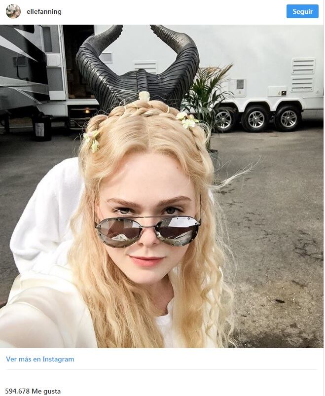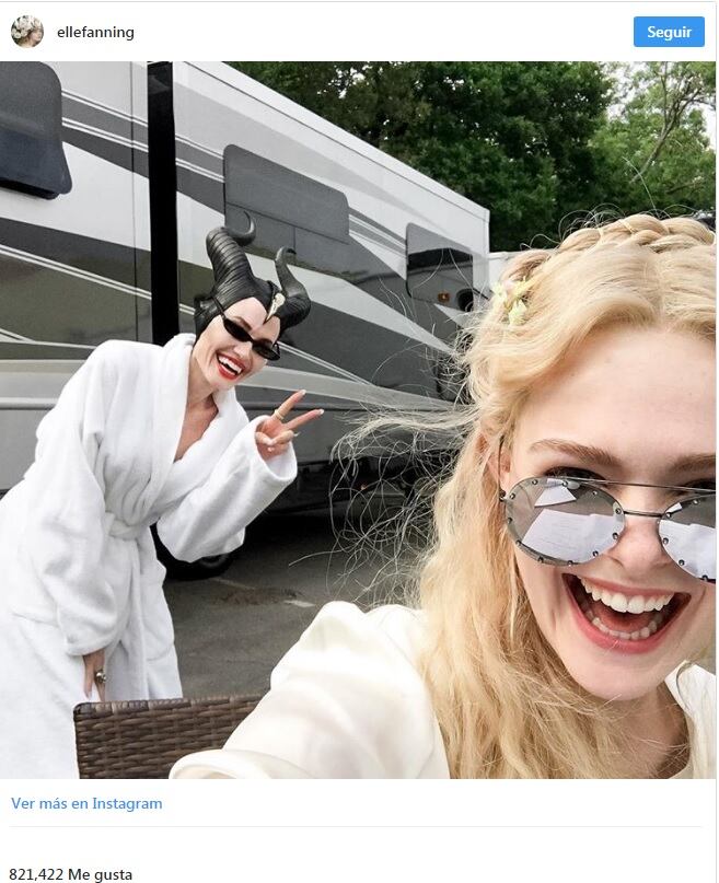 Las dos imágenes que se viralizaron en las redes sociales fueron publicadas por Fanning en su cuenta de Instagram. En las fotos aparece Jolie con los cuernos de Maléfica puestos y en una bata de baño.