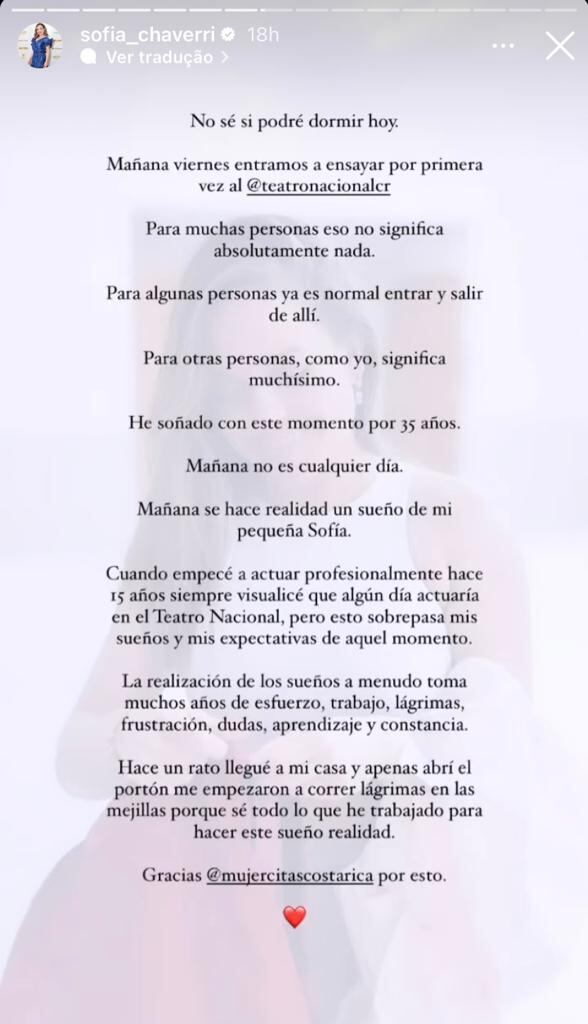 “Cuando empecé a actuar profesionalmente, hace 15 años, siempre visualizé que algún día actuaría en el Teatro Nacional, pero esto sobrepasa mis sueños y mis expectativas de aquel momento”, escribió Sofi en un mensaje que compartió en Instagram.