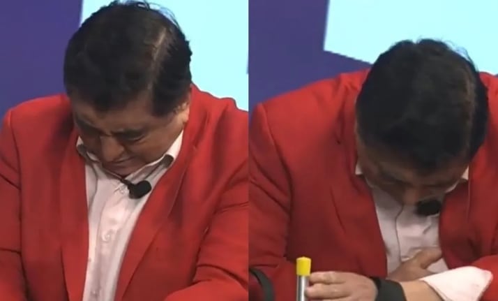 Cuando le preguntaron por tres cosas para quitarse la calentura, no supo contestar y le dieron toques eléctricos y de inmediato se empezó a tocar el pecho con síntomas de dolor, cayó al suelo y los presentadores no sabían ni qué hacer para ayudarlo.