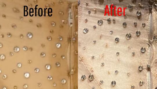La comparación de las tomas parece mostrar pequeños desgarros en la tela en el cierre de la espalda y varios cristales que faltan o cuelgan de un hilo en la parte posterior del vestido.