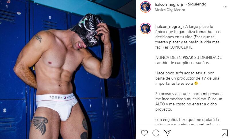 “Con engaños hizo que me quitara la máscara y me pidió que entrara a su proyecto, pero “sin máscara” porque me veía mejor. No acepté porque tengo valores. Venderme sexualmente no va conmigo y porque esta máscara solo la voy a perder en el cuadrilátero pues respeto y amo a la lucha libre”, escribió el Halcón Negro Jr.