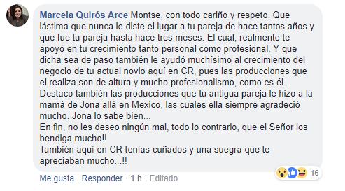 “Que lástima que nunca le diste el lugar a tu pareja de hace tantos años y que fue tu pareja hasta hace tres meses, el cual realmente siempre te apoyó en tu crecimiento tanto personal como profesional. Qué dicha que de paso también le ayudó muchísimo al crecimiento del negocio de tu actual novio aquí en Costa Rica, pues las producciones que realiza son de altura y mucho profesionalismo, como es él”, escribió la mujer en una publicación que realizó De boca en boca en su cuenta de Facebook.