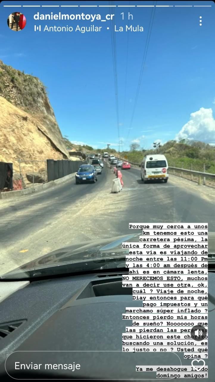 “Muy cerca a unos kilómetros tenemos esto, una carretera pésima, la única forma de aprovechar esta vía es viajando de noche, entre las 11 p.m. y 4 a.m., después de ahí es en cámara lenta. No merecemos esto, muchos van a decir que use otra (ruta). Diay, ¿entonces para qué pago impuestos y un marchamo superinflado?, entonces, ¿pierdo mis horas de sueño?”, publicó.