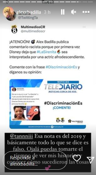 Badilla además mencionó que ya fue a ver la película La Sirenita y la actuación de Halle Bailey le pareció perfecta y que se siente arrepentido por su accionar en aquella ocasión.