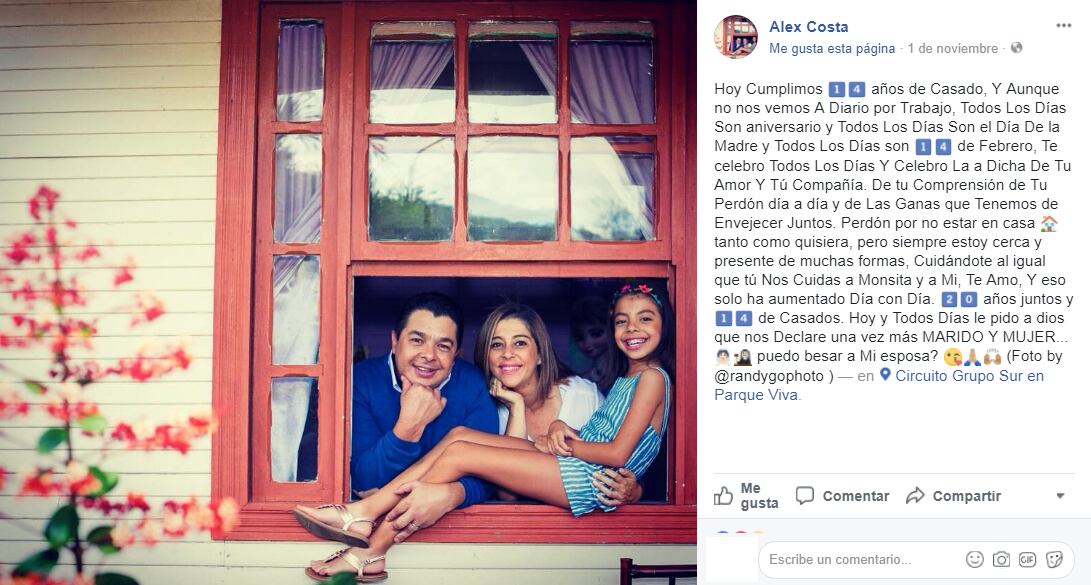El comediante y juez de Dancing with de Stars, Alex Costa, celebró el pasado 1.° de noviembre 14 años de matrimonio y 20 años de estar al lado de su esposa Rebeca Núñez.
