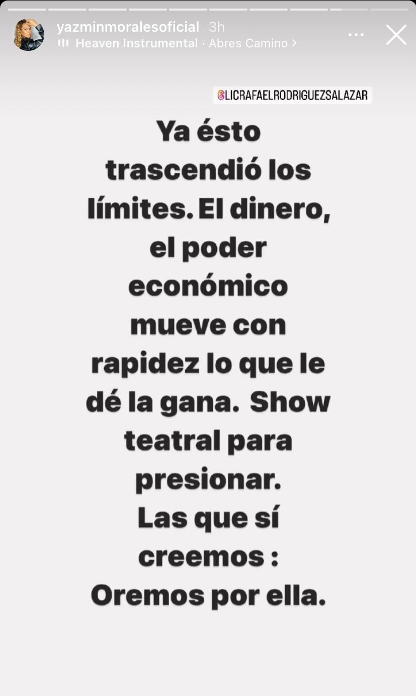 “Ya esto trascendió los límites. El dinero, el poder económico mueve con rapidez lo que le dé la gana. Show teatral para presionar. Las que sí creemos: oremos por ella”, escribió la exreina de belleza.