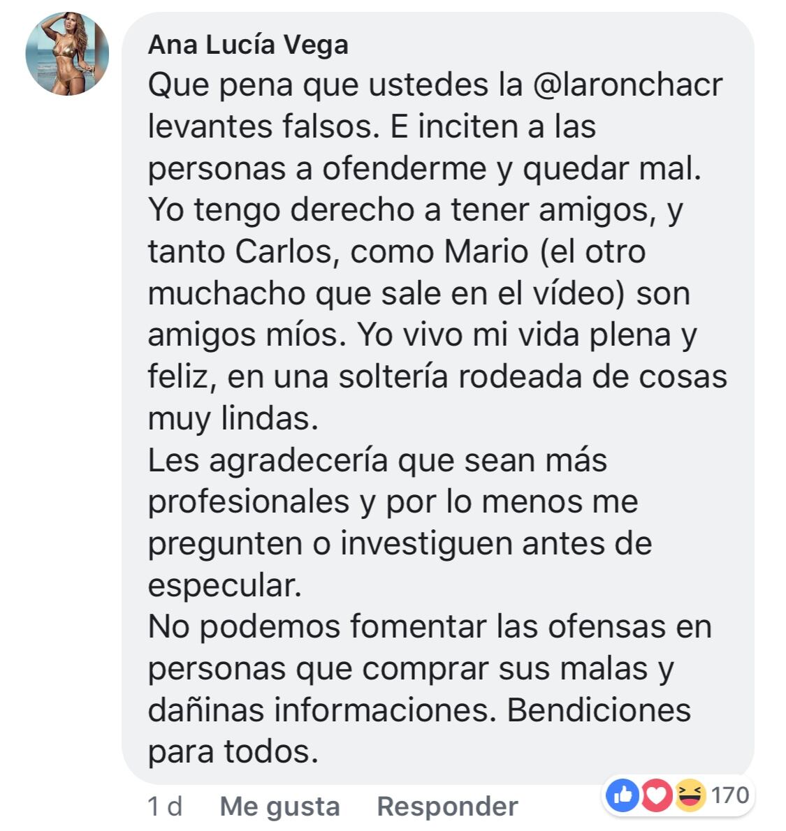 La modelo y presentadora Ana Lucía Vega se chiveó con el programa de espectáculos, La Roncha, por un chisme que le sacaron en relación con un supuesto amorío con Carlos Hernández, ex de la presentadora Keyla Sánchez.