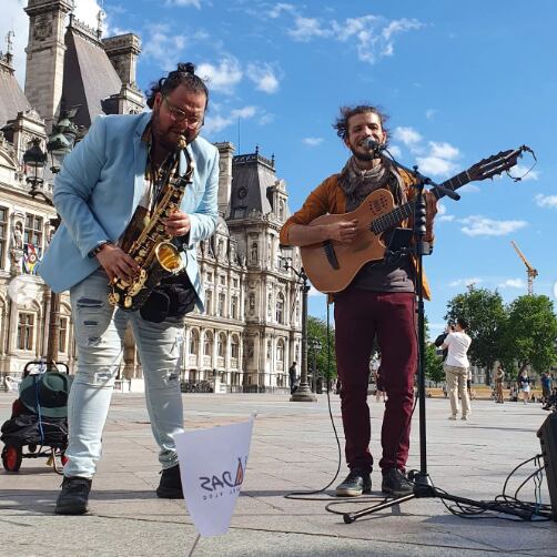 Nos vinimos con una maleta cada uno y en Madrid (España) compramos Martín y yo los parlantes para poder tocar en la calle, el stand. De hecho, vendí mis saxofones en Costa Rica y en París recogí mi nuevo saxofón.