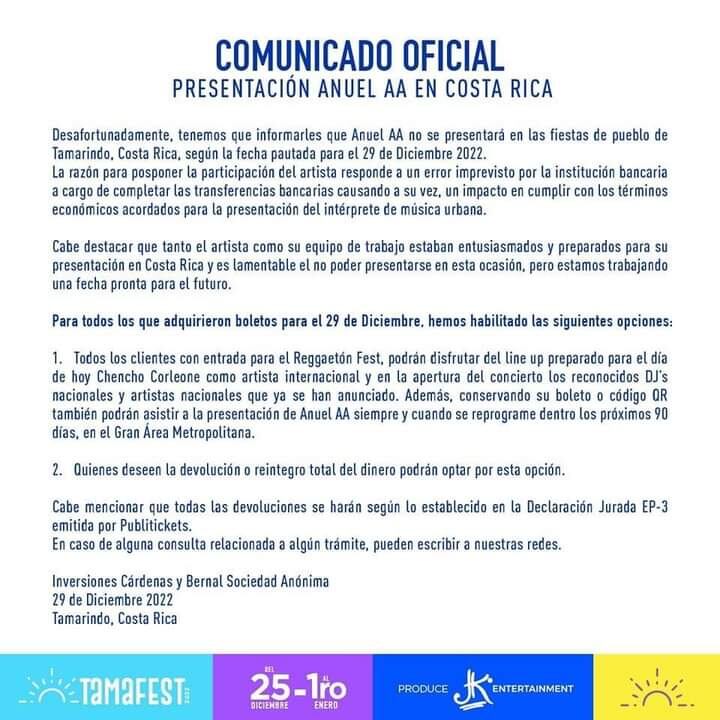 Los que tengan entrada podrán disfrutar del resto del reggaetón fest y conservar la entrada para una futura presentación de Anuel.
