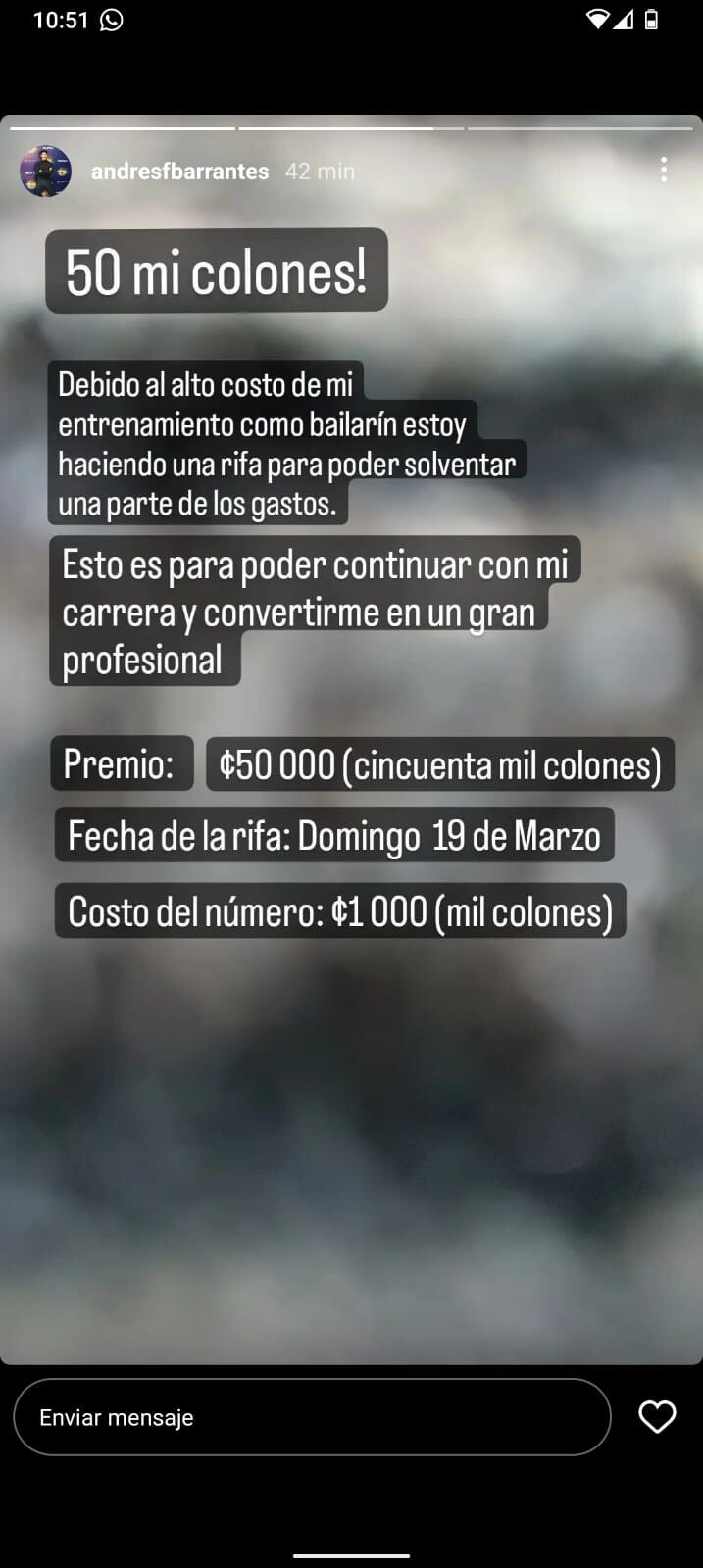 “Debido al alto costo de mi entrenamiento como bailarín, estoy haciendo una rifa para poder solventar una parte de mis gastos. Esto es para poder continuar con mi carrera y convertirme en un gran profesional”, puso el joven en redes sociales.