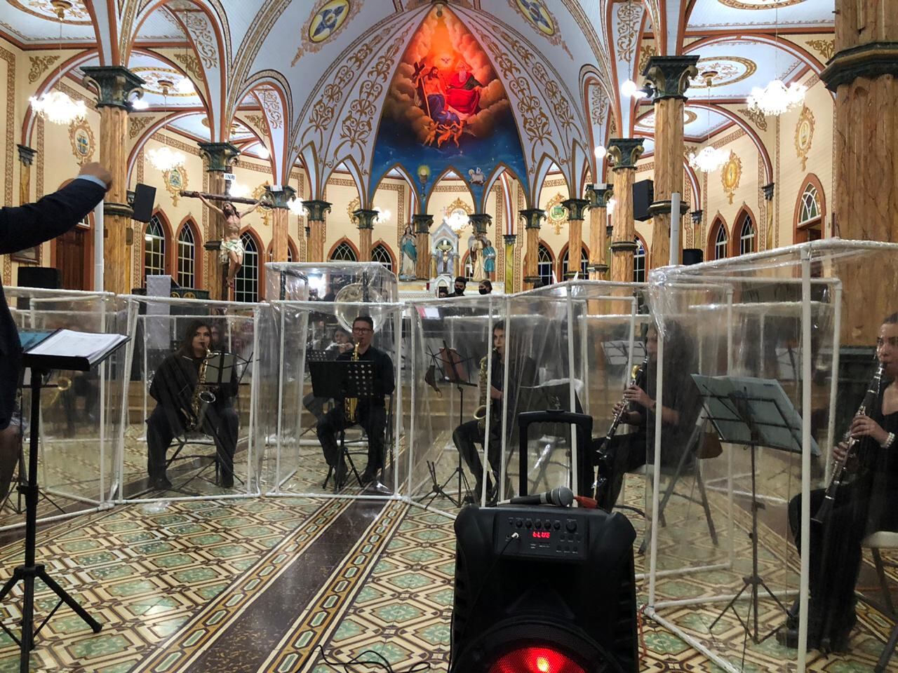 “Se mandaron a hacer hace unos dos meses con PVC y plástico, esto porque los instrumentos de viento expanden saliva a la hora de soplar, entonces no nos hemos querido jugar el chance de ponerlos a tocar sin esa cobertura, construimos 22 y los que no tienen que soplar usan mascarilla”, comentó. Elesban Rodríguez, director de la agrupación.