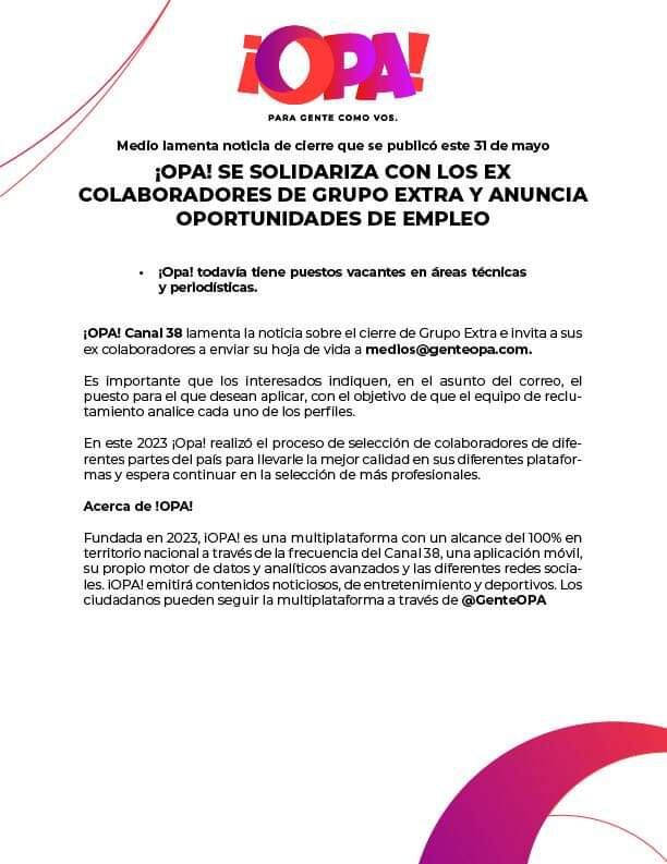 Mediante un comunicado, el medio de comunicación, ¡Opa!, de canal 38, dio a conocer que se solidarizan con las personas que laboraron para Grupo Extra y lamentaron el cierre. Lo bueno es que dio a conocer una buena noticia.