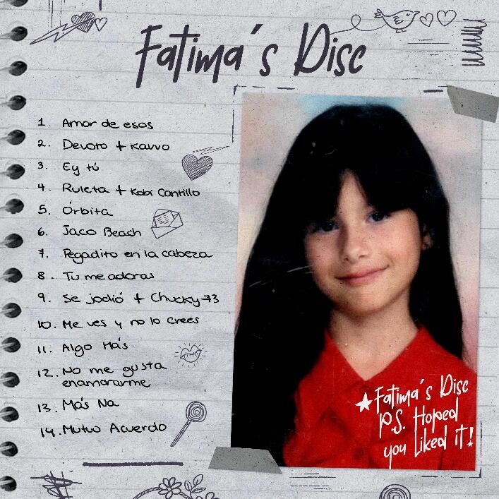 “Fátima’s Disc” viene cargado de reguetón, pop urbano, pop electrónico y baladas, cuenta con colaboraciones de grandes artistas como Kavvo, con quien lanzó la pieza Devoto, así como Kobi Cantillo y Chucky 73.