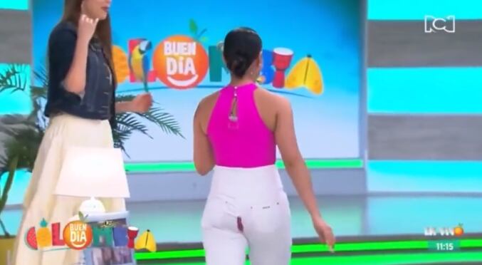 Ella iba caminando junto a la presentadora Violeta Bergonzi y al darle la espalda a la cámara se observa que su pantalón estaba manchado.