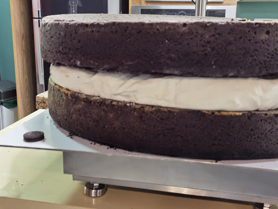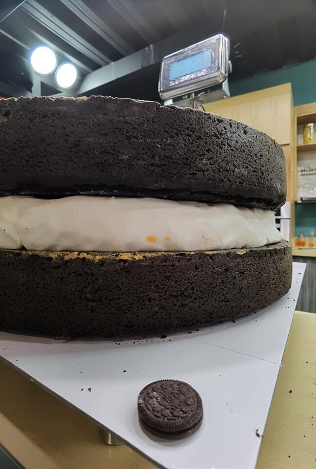 “La gente de Guinness nos pidió que tenía que hacer una galleta de cero, no podíamos usar galleta Oreo molida, que originalmente era el plan, entonces, me tocó investigar bastante y desarrollar una galleta de chocolate oscura, con chocolate derretido, con cacao en polvo amargo, azúcar, huevos, mantequilla y hacer en el tamaño de un molde de nueve pulgadas para una primera versión”, contó.