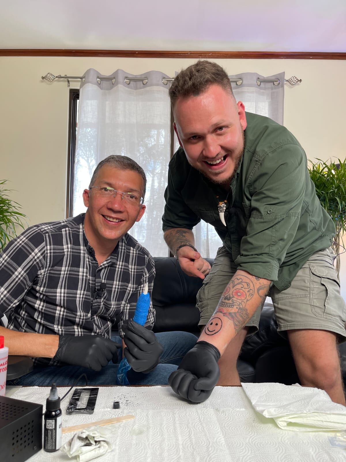 A mí me gusta tatuar, no soy tatuador pero llevé unos cursos y siempre me ha gustado dibujar, también tengo mi propio equipo para tatuar.