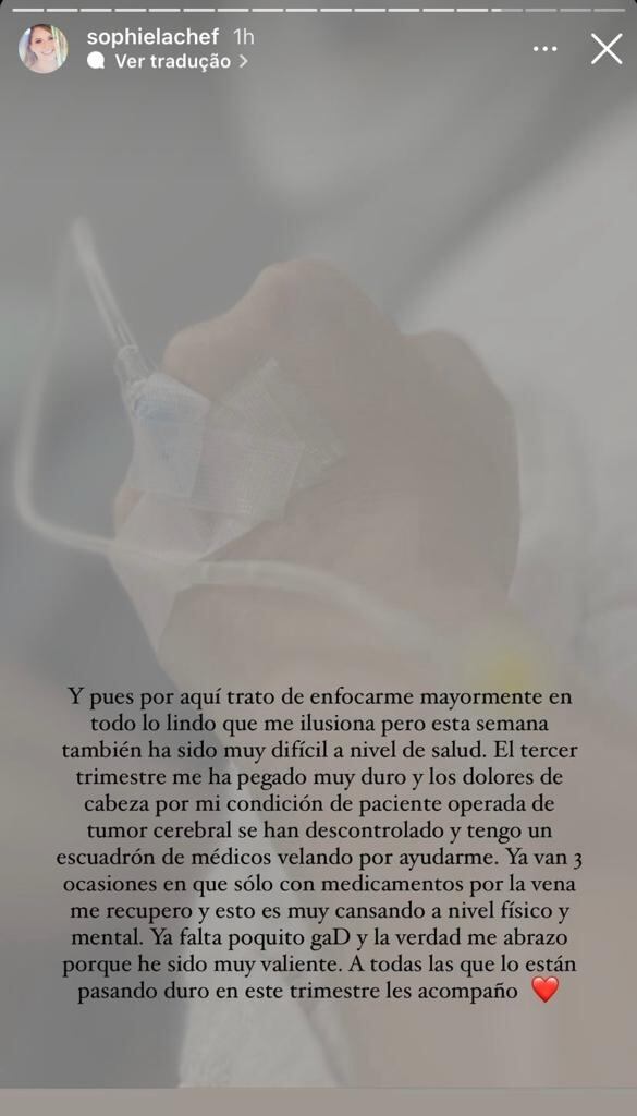 Hace unos días, Sophi se sinceró también en las redes sociales y contó a sus miles de seguidores que la cirugía por tumor cerebral a la que se sometió en el 2016 le estaba complicando las últimas semanas del embarazo, debido a que se le manifestaban dolores de cabeza muy fuertes que la tenían cansada física y mentalmente.
