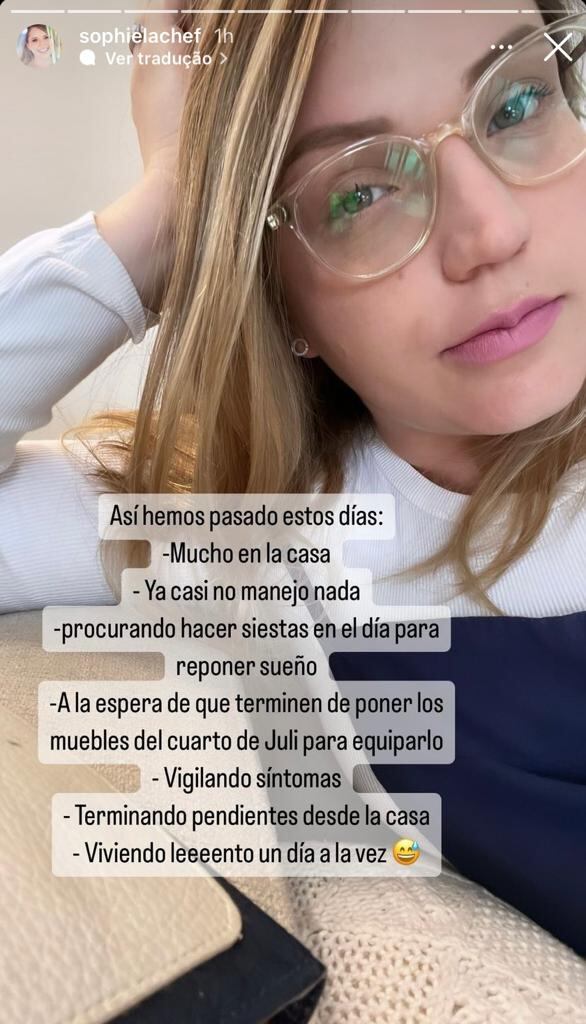 “Así hemos pasado estos días: mucho en la casa, ya casi no manejo nada, procurando hacer siestas en el día para reponer sueño, a la espera de que terminen de poner los muebles en el cuarto de Juli para equiparlo, vigilando síntomas, terminando pendientes desde la casa y viviendo lento un día a la vez”, escribió Sophi en sus historias de Instagram.