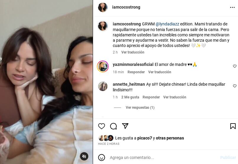 “Mami tratando de maquillarme porque no tenía fuerzas para salir de la cama, pero rápidamente ustedes, tan increíbles como siempre, me motivaron a pararme y ayudarme a vestir. No saben la fuerza que me dan y cuánto aprecio el apoyo de todos ustedes”, escribió Coco en su “muro” de Instagram, al compartir un video donde su mamita la está maquillando.
