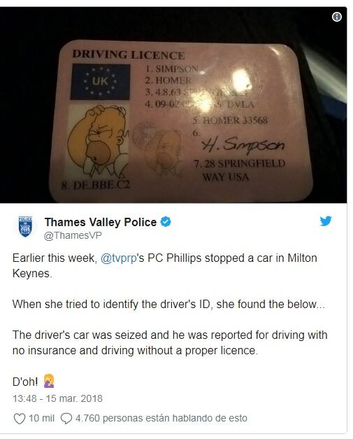 Según informó la revista TV Notas, al hombre lo detuvieron por conducir sin seguro; sin embargo, los oficiales se imaginaron todo, menos que les mostraría una licencia con los datos de Homero Simpson.