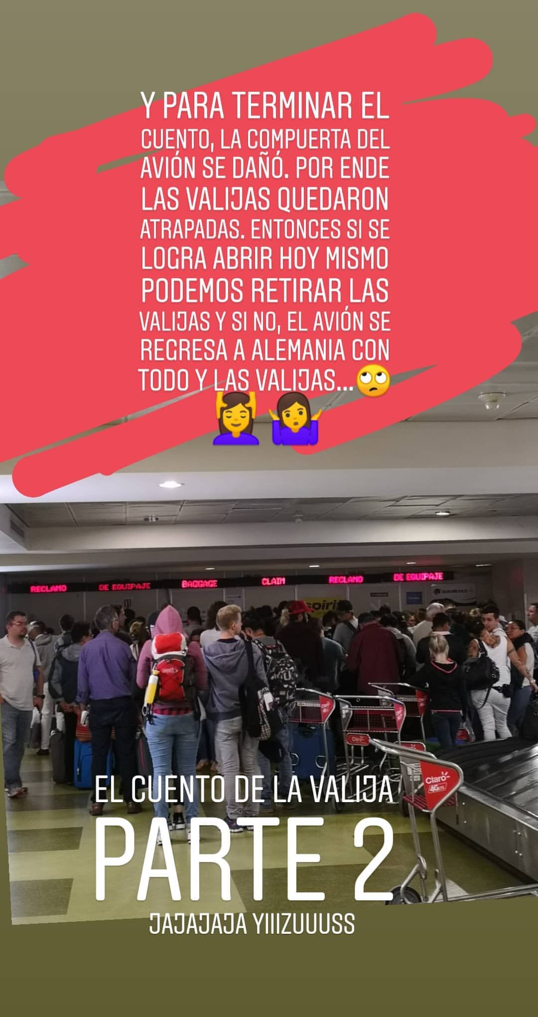 De acuerdo con varias historias que compartió en su cuenta de Instagram, la compuerta del avión se daño, por lo que las maletas, de todas las personas que venían en el vuelo, quedaron atrapadas.