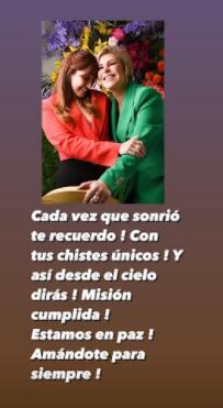 Vieras que como pasó algo tan terrible y tan triste, el que yo no esté en televisión ya no es importante para mí, ni un gramo, porque es tanto mi dolor (por su viudez) que lo malo o bueno de como terminó eso no lo sentimos ninguna de las dos. Listo, seguimos para adelante, ni dolor me causó (el despido de su hija), más bien fue agradecimiento porque ahora estamos muy bien.