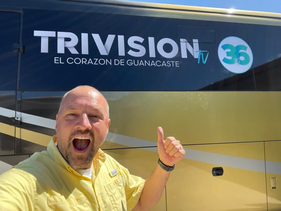 El nuevo bus de Teletica es el que lleva a todo el personal a Palmares para la transmisión de los toros.