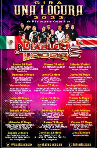 Se viene un super evento para tod@s los amantes del baile 🕺💃 EN CONCIERTO 7 DE MAYO 🇨🇷Pimienta Negra🎙️ y 🎤Diablos Loocos🇲🇽 3 fases de pre venta: Del 7 al 21 de abril a 6 mil Del 21 al 5 de mayo 7 mil Cierre de pre venta Día del evento 8 mil Pre venta limitada simpe móvil. 62-26-52-86