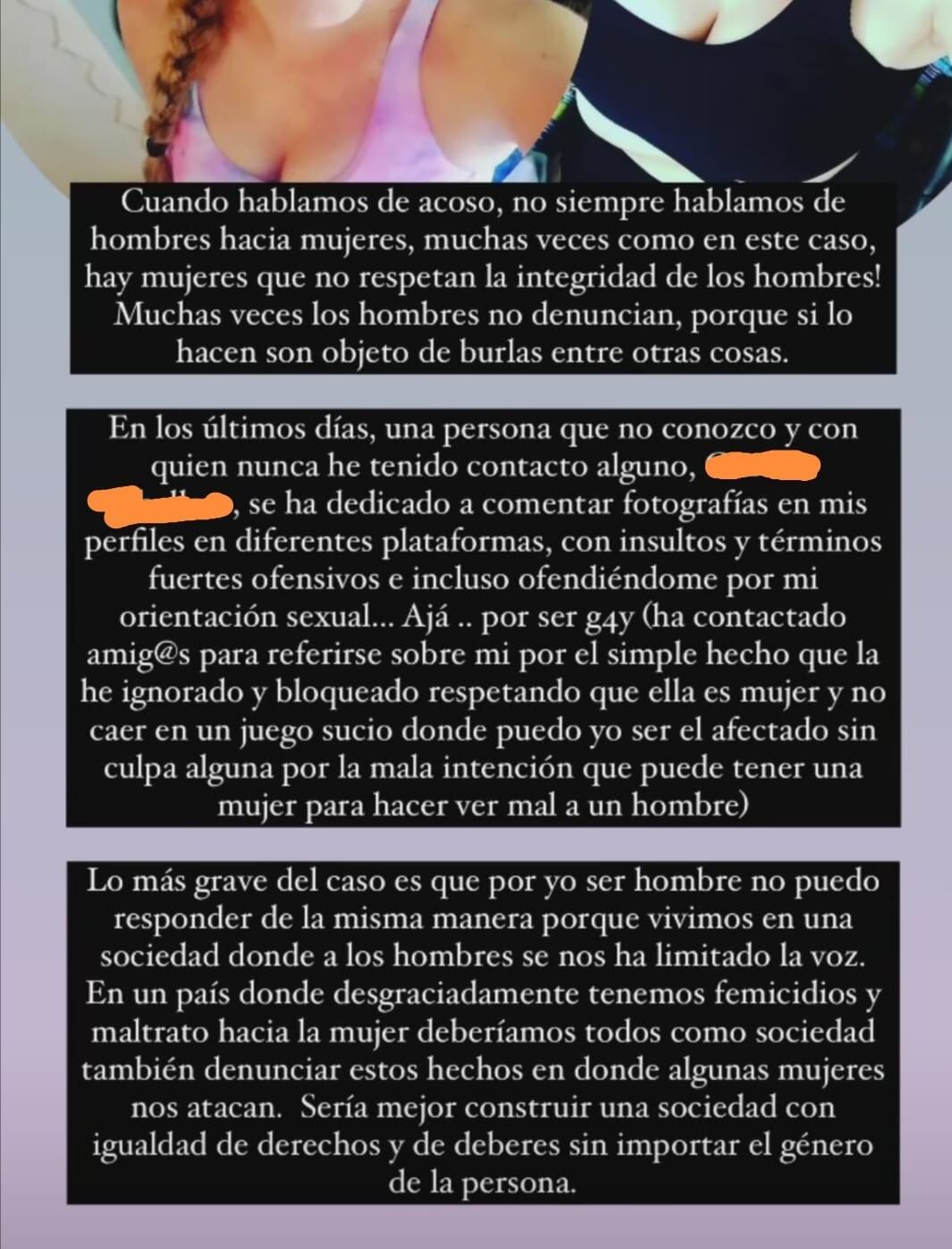 “Una persona que no conozco y con quien nunca he tenido contacto alguno, (nombre de la usuaria), se ha dedicado a comentar fotografías en mis perfiles en diferentes plataformas con insultos y términos fuertes, ofensivos e incluso ofendiéndome por mi orientación sexual... ajá por ser gay”, escribió.