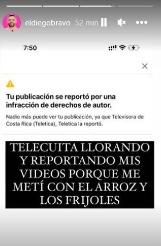 Él mostró un pantallazo donde se logra ver que Televisora de Costa Rica reportó su último video por una infracción de derechos de autor.
