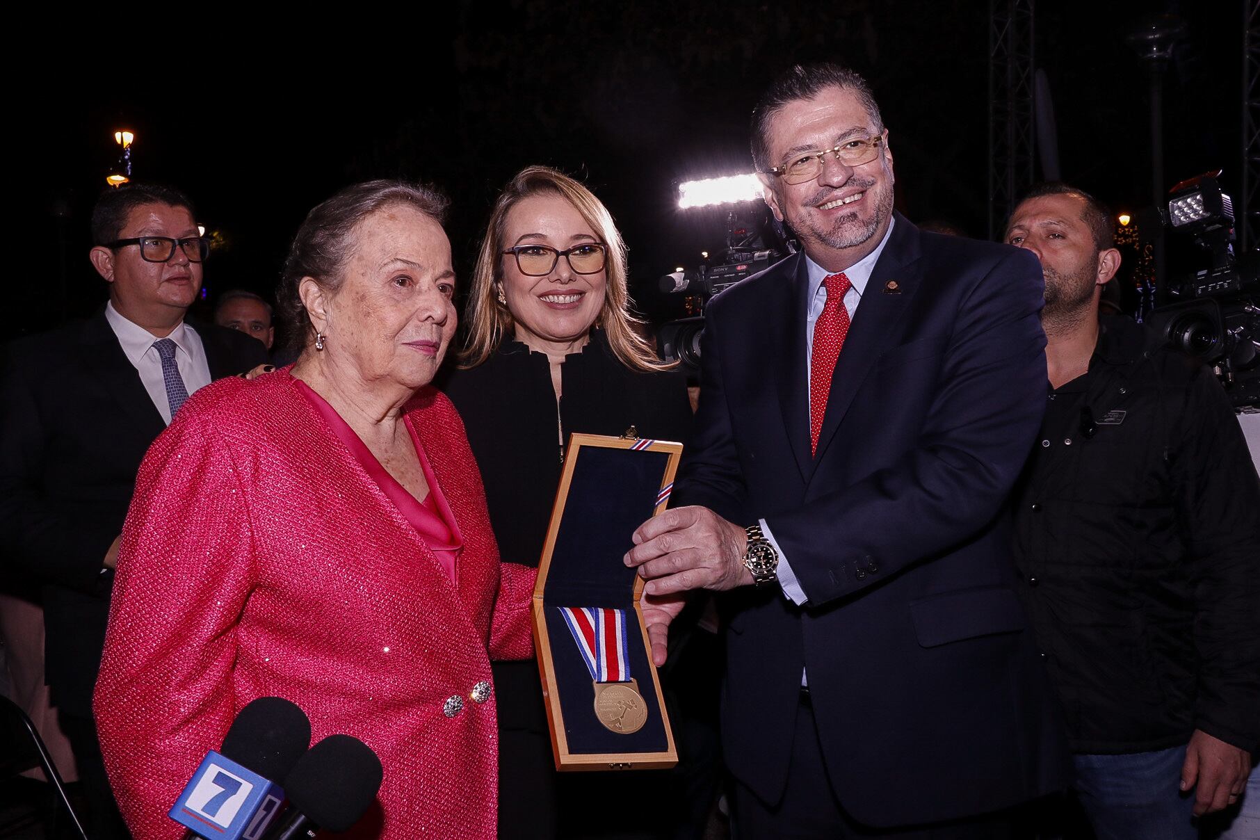 “Su contribución por décadas merece el honor que me doy de presentarle la medalla de mérito en la Paz y en la Democracia, muchas gracias a nombre de todos los costarricenses”, le dijo Chaves a la señora.
