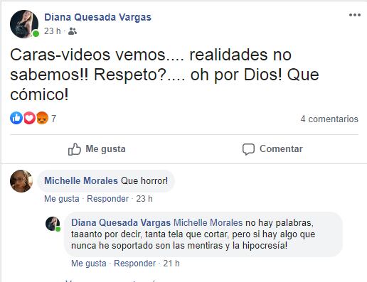 Tras darse a conocer la noticia, Diana escribió en su cuenta de Facebook: “Caras-videos vemos.... realidades no sabemos!!. ¿Respeto?.... oh por Dios! ¡Qué cómico!”