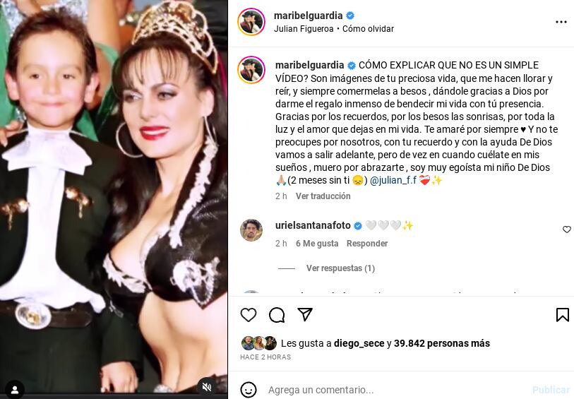 La costarricense Maribel Guardia dedicó un estremecedor mensaje a su hijo Julián Figueroa al recordarlo a dos meses de su fallecimiento.