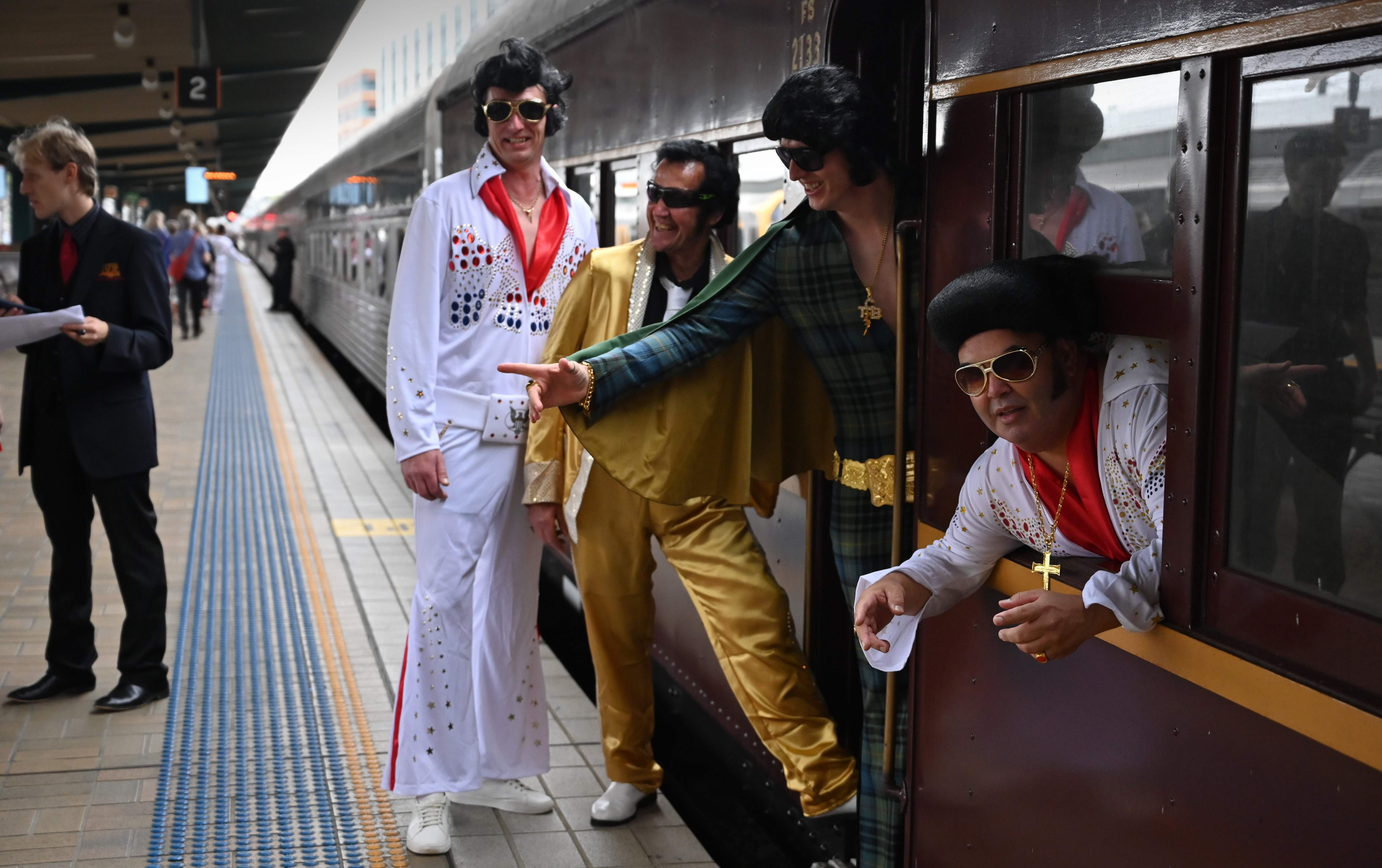 Los fans visten los famosos trajes blancos, cadenas doradas y pelucas negras para parecerse a su ídolo, Elvis Presley.