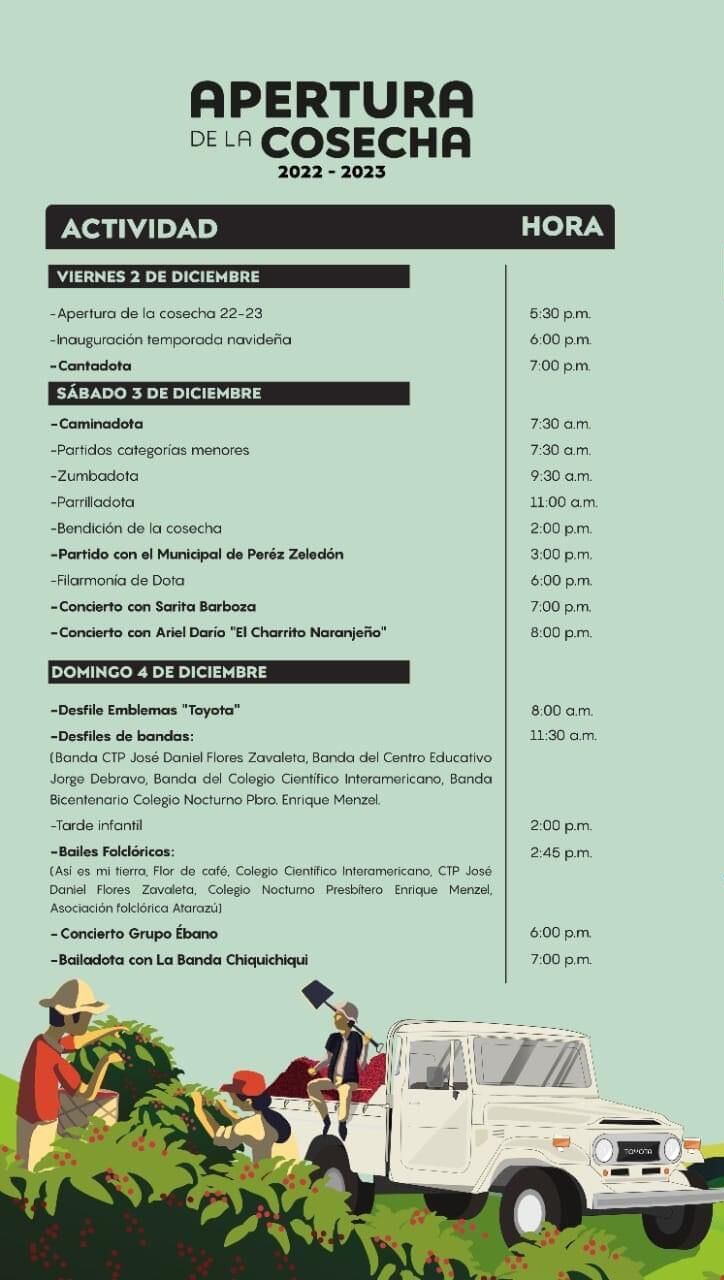 Además, se realizará una feria de emprendedores de los tres cantones de Los Santos: Dota, Tarrazú y León Cortés. Habrá ricas comidas tradicionales a cargo de la comunidad de Copey de Dota, así como conciertos, actividades deportivas, como la CaminaDota, el día sábado, con un recorrido por la comunidad de Santa María a través de caminos de cafetales y vistas al valle. También conciertos con talentos locales así como artistas nacionales como Sarita Barboza, Ariel Darío y la Banda Chiqui Chiqui para el cierre de las actividades.
