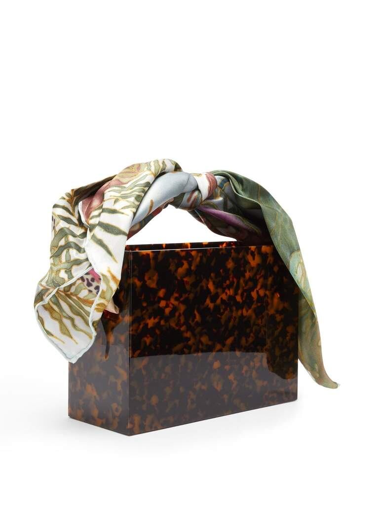 El accesorio está hecha de acrílico y en la agarradera tiene amarrada una bufanda de seda estampada con un diseño de plantas.
